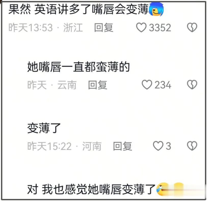 有网友告成点出要津,正本英语说多了,嘴唇真的会变薄,连带着面相齐变了。