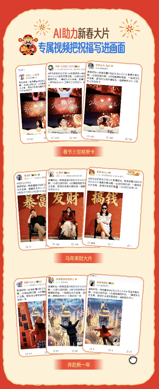 春节期间,微博累计送出超65万份、140+款适度红包封面。其中82款明星封面解锁星粉互动新姿势;43款IP封面让破次元年味拉满;18款品牌蓝V携代言东谈主都贺年,更有“随即来财”适度款大受接待。合作AI工夫助力的新春大片,网友可将专属祈福写进画面,让赛博红包充满真的温度。