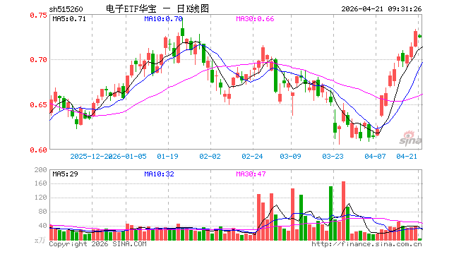 4月21日,电子ETF华宝(515260)开盘跌0.68%,报0.726元。电子ETF华宝(515260)重仓股方面,立讯精密开盘跌1.32%,寒武纪跌1.25%,工业富联跌0.88%,中芯海外跌0.58%,海光信息跌0.68%,朔方华创涨0.15%,开云体育app胜宏科技跌3.79%,京东方A涨0.00%,兆易改进涨0.09%,澜起科技涨0.02%。