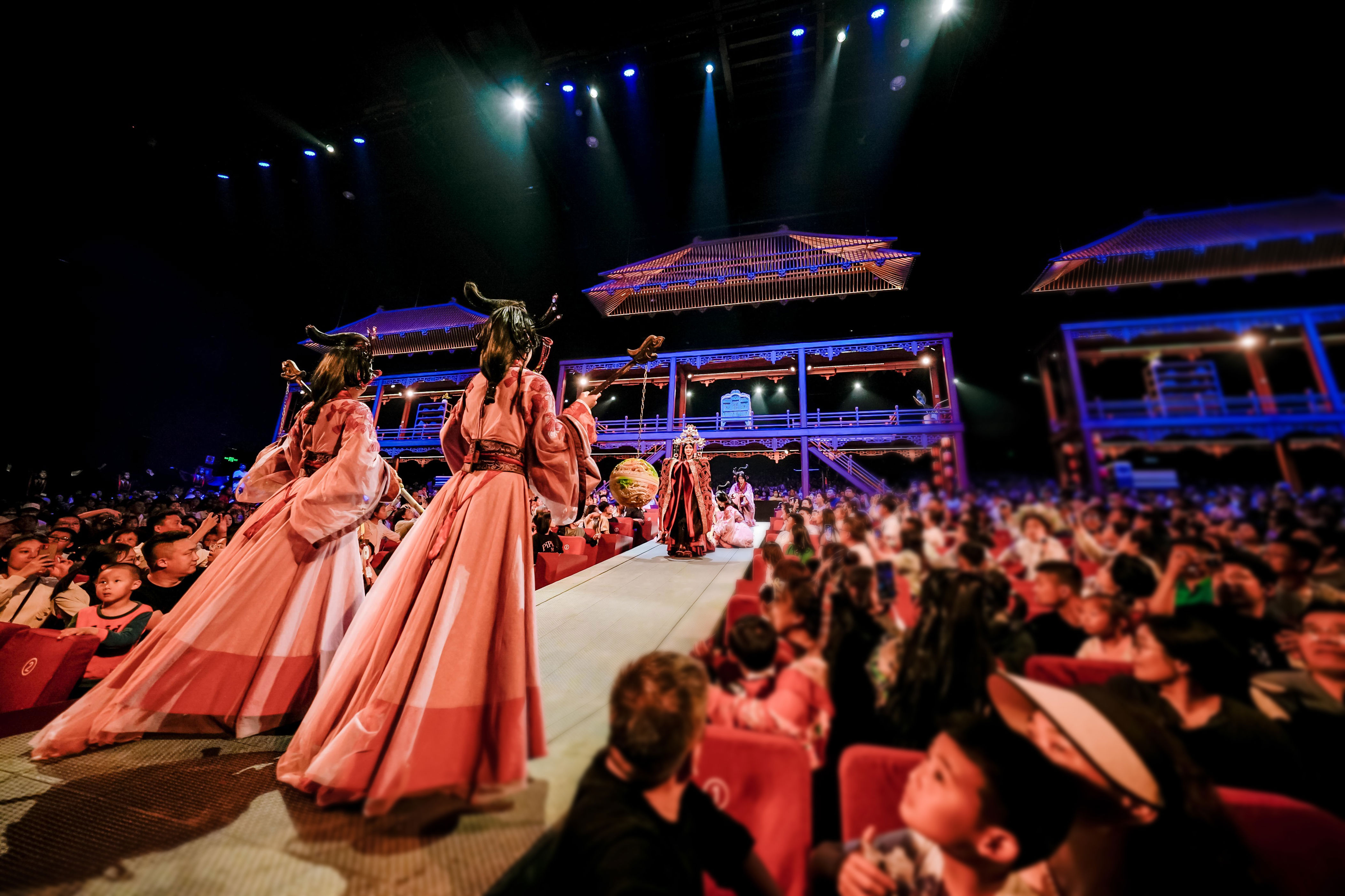 上演现场,巍峨城墙拔地而起,大唐宫殿破水而出,上百匹战马奔腾呼啸,配备400余套高技术舞台设置、4000余台灯光、600余套服装及千余套舞好意思说念具,为现场4200余名不雅众带来了千里浸式的视听荡漾。来自上海的搭客周女士在不雅演后欢快地示意:“在现场与四千多东说念主扫数感受那种家国心扉踟蹰,镜头根底拍不出那种荡漾!”